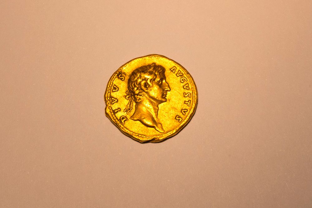 La moneda, del año 107 después de Cristo, lleva la imagen del emperador romano Augusto. Fue acuñada como parte de una serie de monedas en honor de mandatarios romanos.