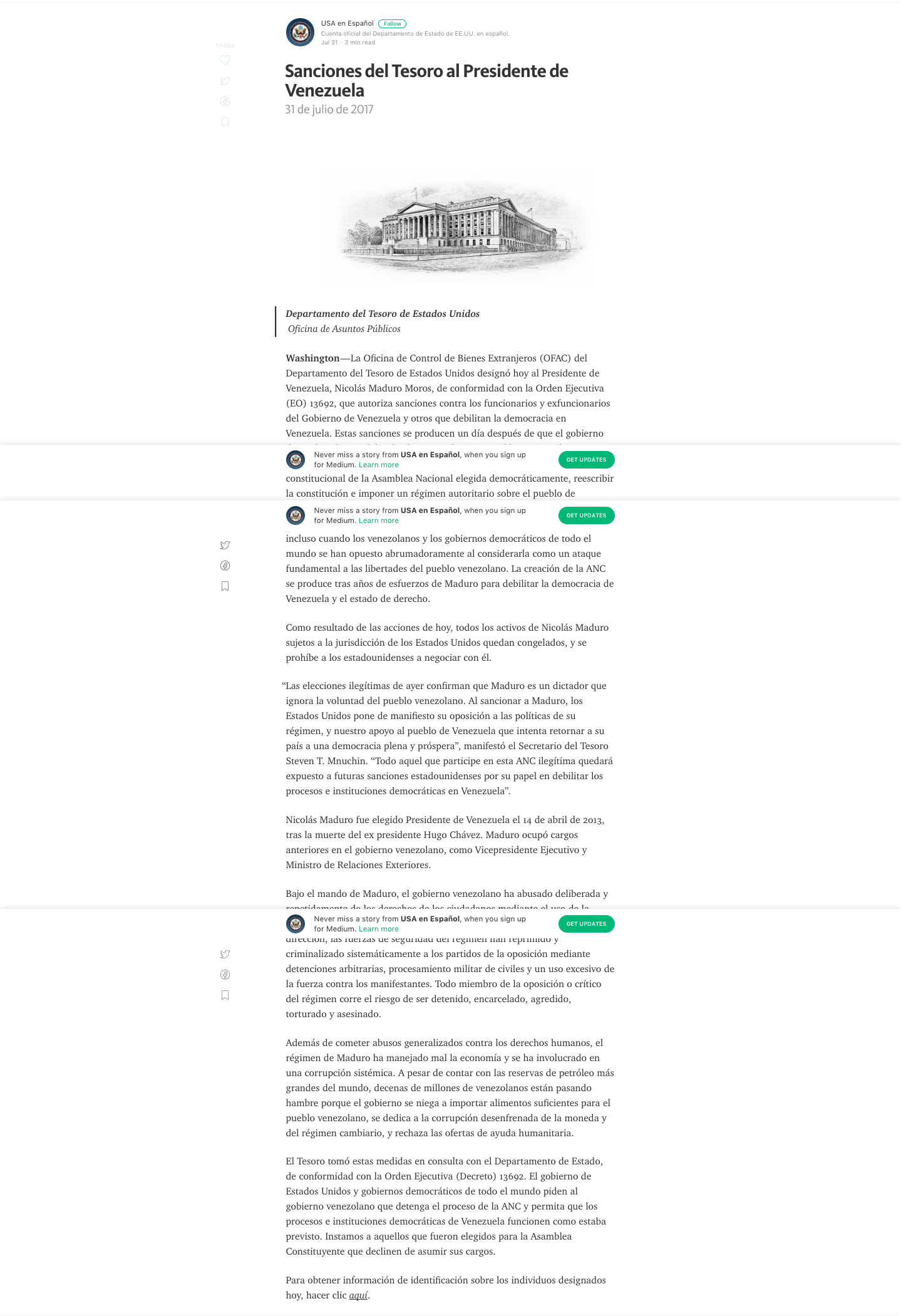 “Las elecciones ilegítimas de ayer confirman que Maduro es un dictador que ignora la voluntad del pueblo venezolano. Al sancionar a Maduro, los Estados Unidos pone de manifiesto su oposición a las políticas de su régimen, y nuestro apoyo al pueblo de Venezuela que intenta retornar a su país a una democracia plena y próspera”, manifestó el Secretario del Tesoro Steven T. Mnuchin. “Todo aquel que participe en esta ANC ilegítima quedará expuesto a futuras sanciones estadounidenses por su papel en debilitar los procesos e instituciones democráticas en Venezuela”.