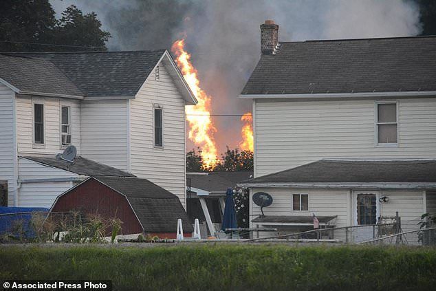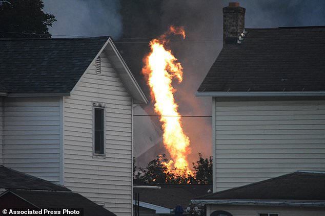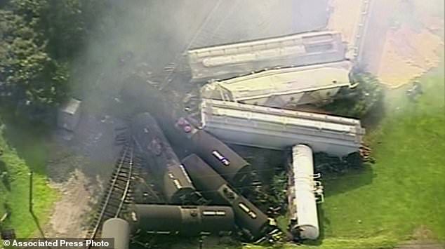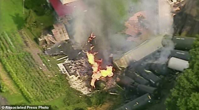 Al menos un vagón cargado de gas licuado de petróleo y otro con azufre derretido volcaron y se incendiaron. El garaje de una vivienda también se incendió, según las autoridades.