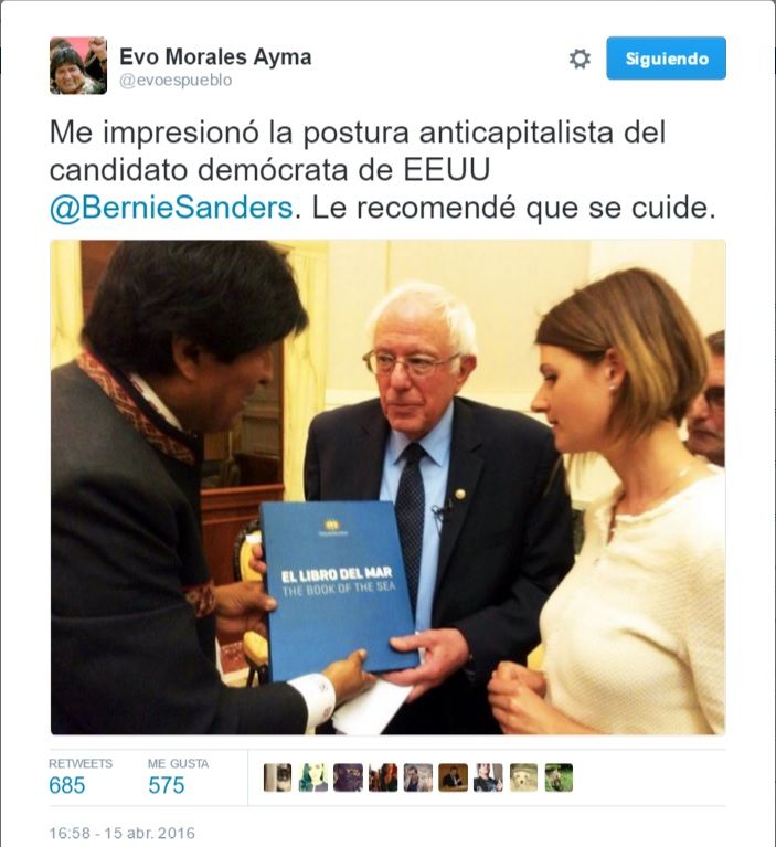 Más tarde, el mandatario boliviano publicó un segundo mensaje, en este caso sobre el precandidato demócrata a la Presidencia de Estados Unidos, Bernie Sanders, con quien asiste al Tercer Encuentro Mundial de los Movimientos Sociales, en Roma.