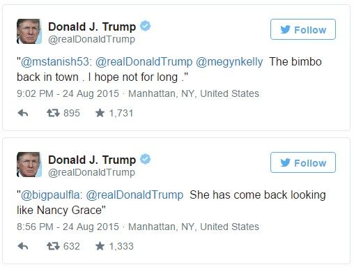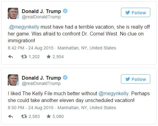 Además que en Twitter la llamó “bimbo”, un término coloquial para referirse a una mujer supuestamente tonta y superficial, por lo que el presidente Fox News, Roger Ailes, pidió al empresario disculparse con la presentadora.