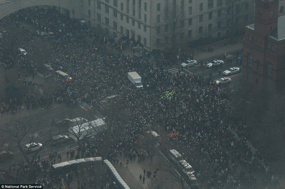 Según las fotografías, se puede calcular que a la primera toma de posesión de Barack Obama en 2009, acudieron 1.8 millones de personas, mientras en su segunda vez había un millón; al jurar el cargo el actual presidente estadounidense, había entre 900 mil y 700 mil asistentes.