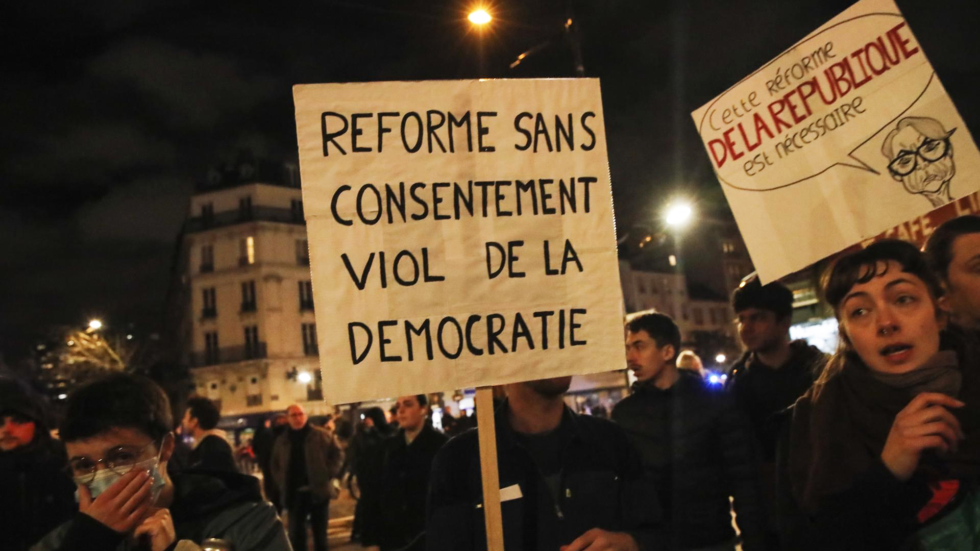 Al menos una centena de arrestos se produjeron la última noche en las protestas antigubernamentales en Francia contra la aprobación por decreto de la reforma de las pensiones, que aumenta la edad mínima de jubilación de 62 a 64 años.