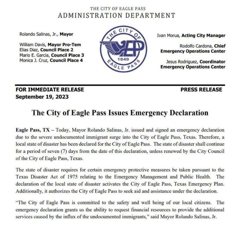 La llegada de migrantes a esta zona obligó al alcalde de Eagle Pass, Rolando Salinas Jr, a declarar el pasado martes el estado de emergencia para disponer de recursos para atender el flujo de migrantes, que atraviesa el Río Grande (río Bravo en México), la frontera natural entre los dos países.