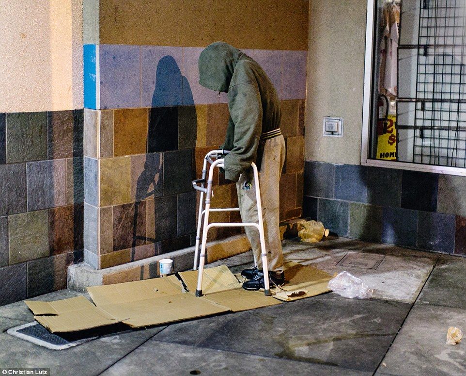 Las imágenes capturaron a indigentes sin hogar, una pareja durmiendo en la calle pintados con brillantina dorada y a un niño triste abrazando a un oso de peluche.