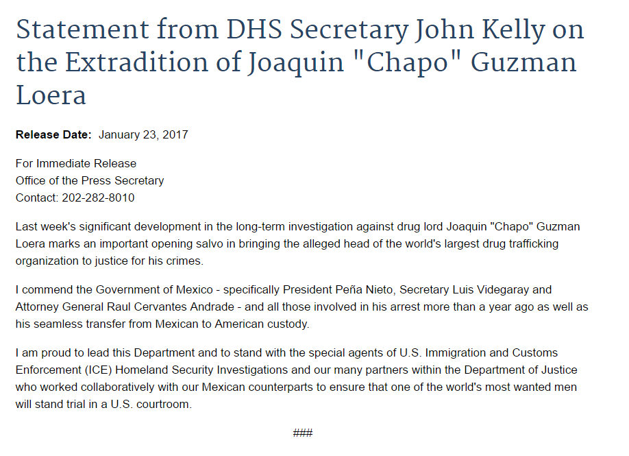 “Alabo al Gobierno de México -en concreto al presidente Peña Nieto, al ministro Luis Videgaray y al fiscal general Raúl Cervantes Andrade- y a todos los implicados en su arresto hace más de un año, así como en su impecable transferencia de custodia mexicana a custodia estadounidense”, señaló el jefe de Seguridad Nacional en un comunicado.