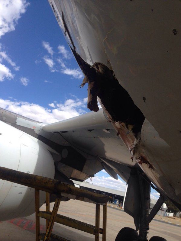 En el aeropuerto internacional Windhoek Hosea Kutako, el avión aterrizó sin problemas y nadie resultó herido, pero más tarde un usuario de Twitter tuiteó una fotografía de los daños que el pájaro causó en la parte inferior del fuselaje.