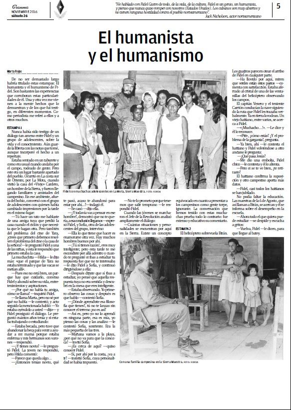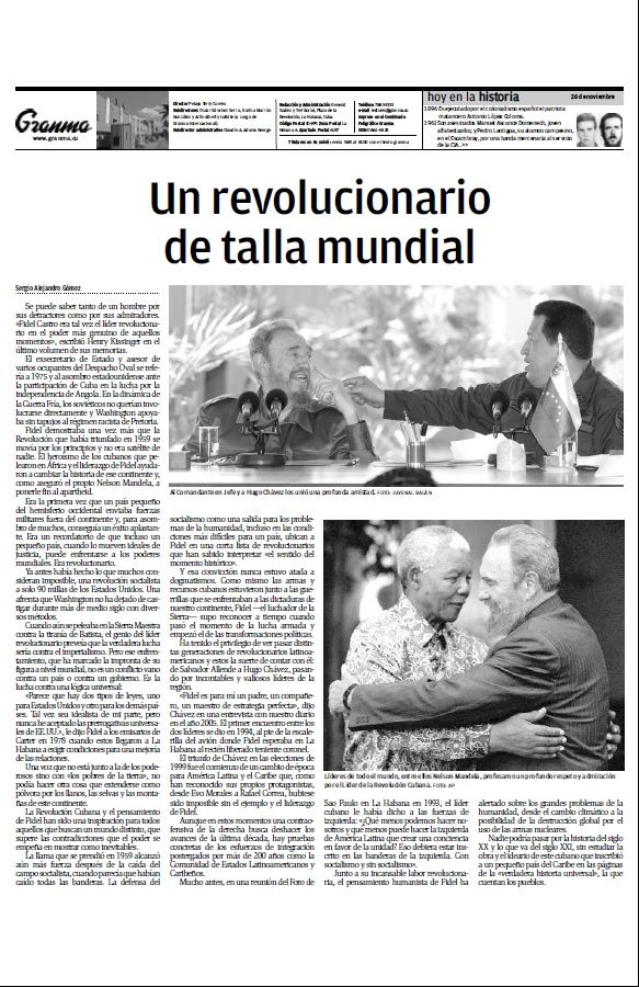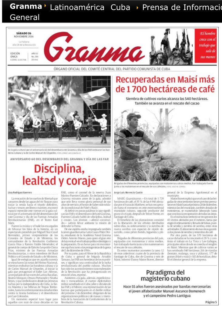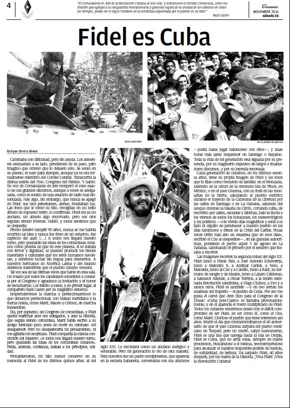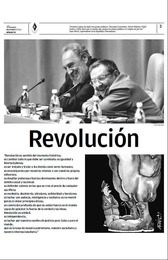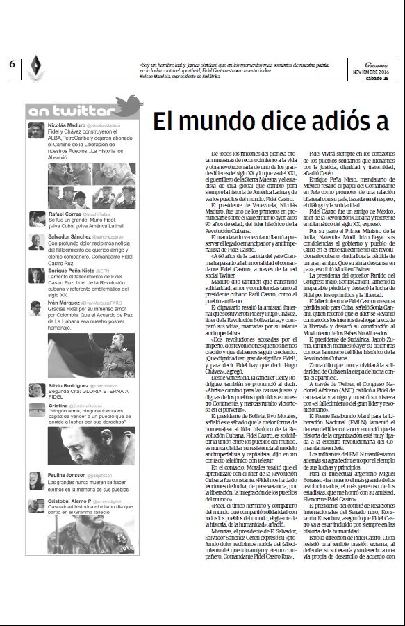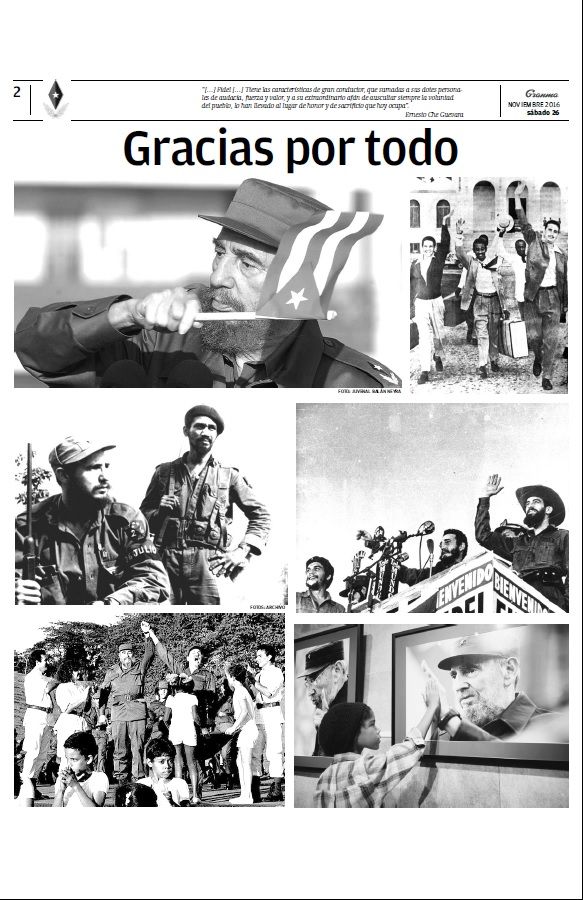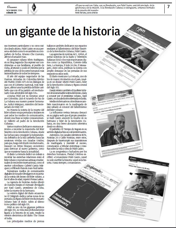 En un desplegado de ocho páginas, el medio relata el mensaje que dio Raúl Castro confirmando la muerte del revolucionario, la forma en que se decretó el Duelo Nacional de nueve días, una galería de imágenes, las reacciones en el mundo y una reflexión que tituló “un revolucionario de talla mundial”.