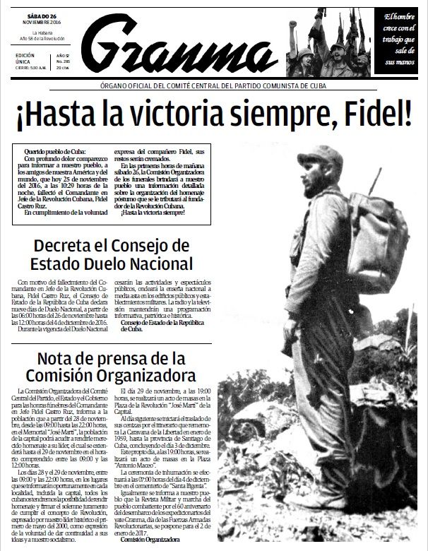La noticia de la muerte de Fidel Castro tomó por sorpresa al diario. Desde anoche en el momento en que se difundió la noticia de la muerte de Fidel, el Granma parecía tener ya su edición impresa de este sábado hecha, destacando noticias como la recuperación de mil 700 hectáreas de café en Maisí, o el 60 aniversario del desembarco del Granma y día de las Fuerzas Armadas Revolucionarias de Cuba.