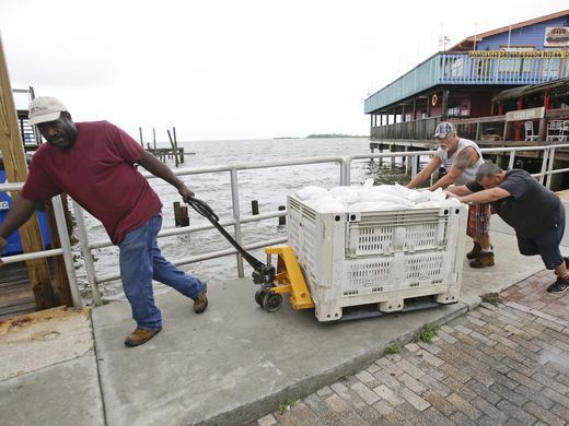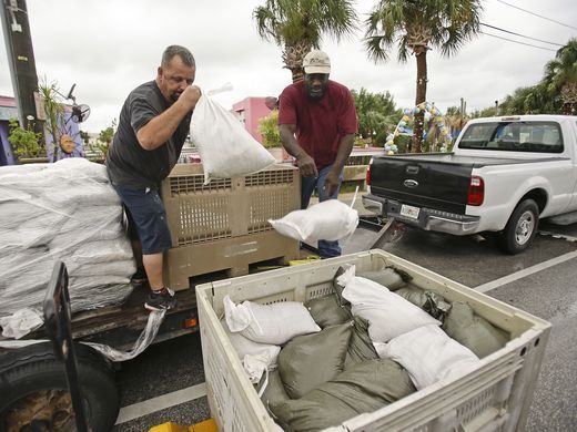 Daniel Fink, izquierda, y Pete Stefani llenan bolsas de arena en el Cedar Cove Hotel a la espera de la tormenta tropical Hermine. Foto de AP.