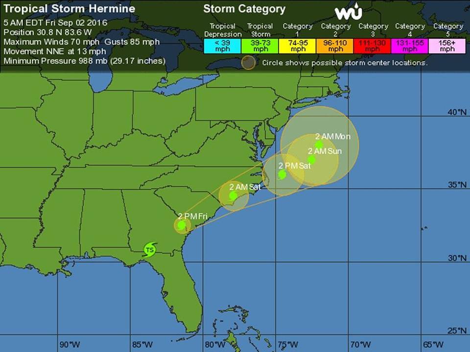 A las 8:00 h, Hermine se debilitaba en su avance hacia el sur de Georgia, explicó el Centro de Huracanes. El centro de la tormenta estaba a unos 52 kilómetros al noreste de Valdosta, en Georgia, y se movía en dirección norte-noreste a 22.5 kmh. Se espera que tras cruzar Georgia, avance a las Carolinas y la costa Este, con posibilidad de lluvias torrenciales e inundaciones.