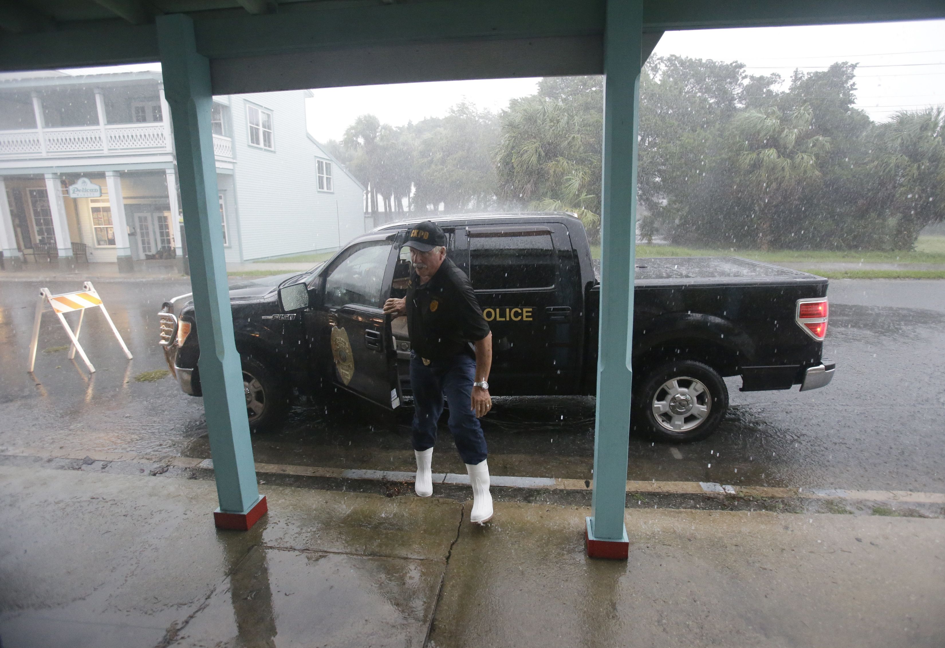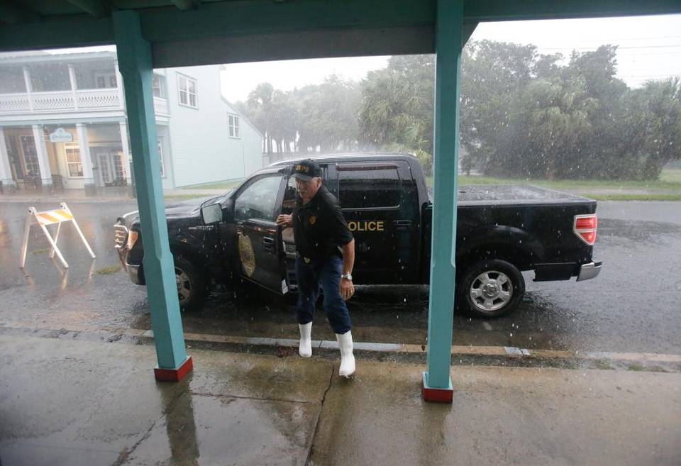 El jefe de la policía de Cedar Key, Virgil Sandlin, comprueba un edificio en el centro de la localidad ante la llegada del huracán Hermine a la costa de Florida. Foto de AP.