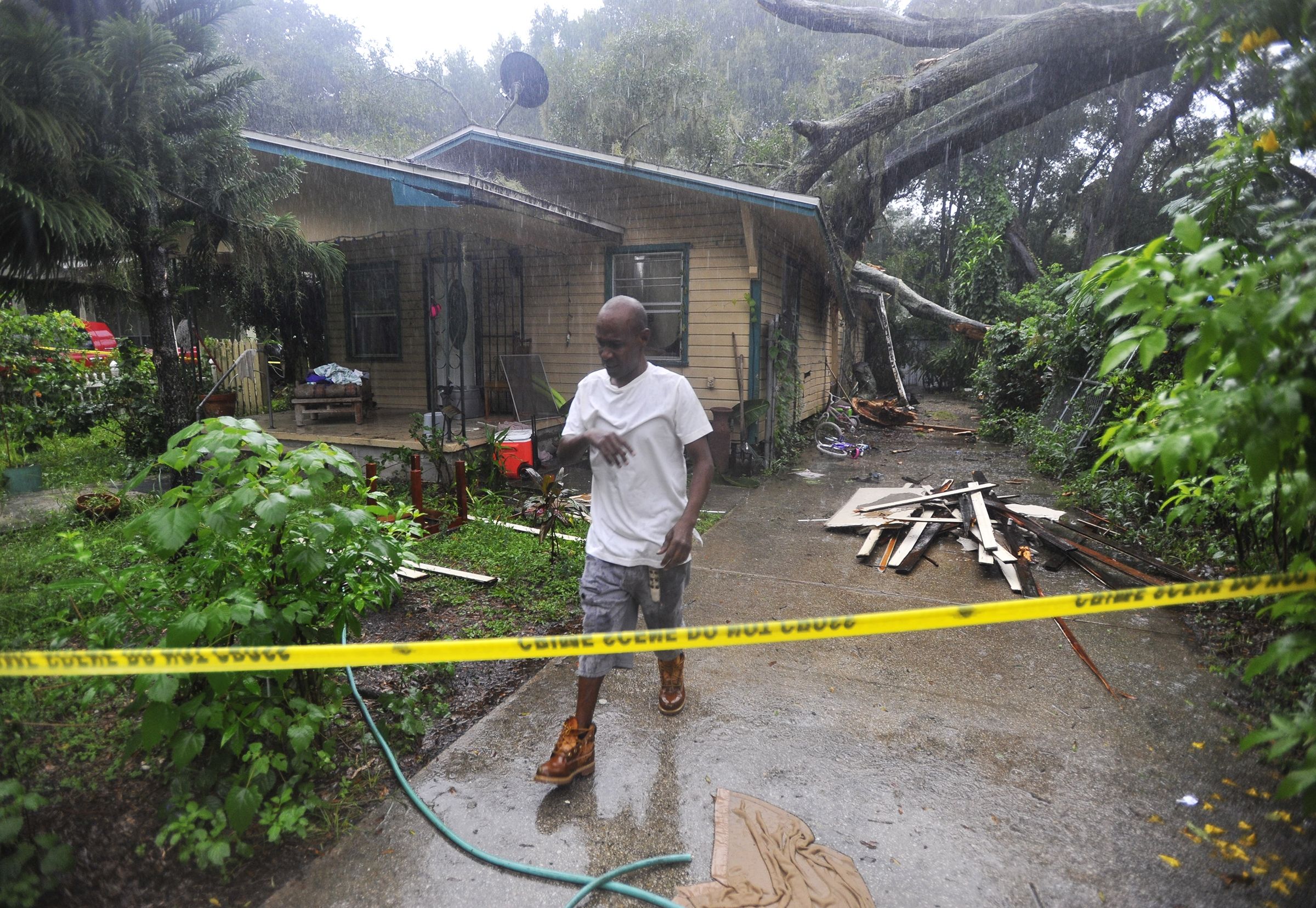 Andre Anton se toma un descanso recuperando las pertenencias de su familia de su casa, donde la lluvia sigue atravesando el agujero abierto en el tejado por un árbol caído. Foto de AP.