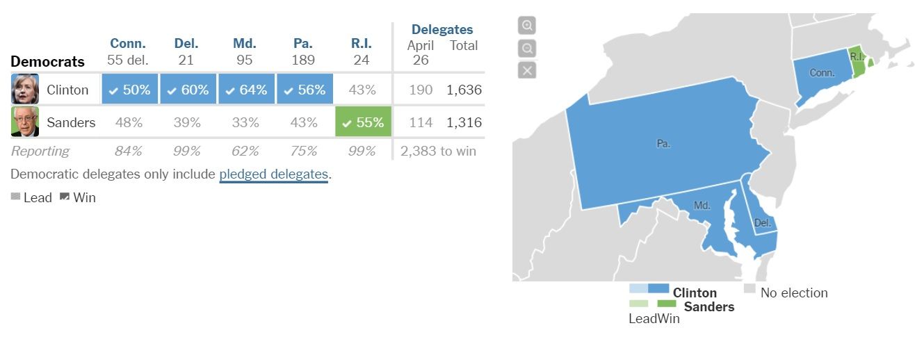 Por el lado demócrata, Hillary Clinton ganó con autoridad las elecciones primarias demócratas en Delaware, Maryland, Connecticut y Pennsylvania. Su rival, Bernie Sanders, ganó Rhode Island.
