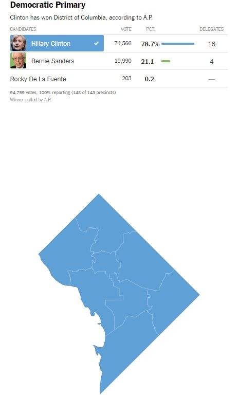 La probable nominada a la presidencia por el Partido Demócrata terminó el martes su campaña en las primarias con un triunfo sobre el senador Bernie Sanders de Vermont en Washington, D.C.