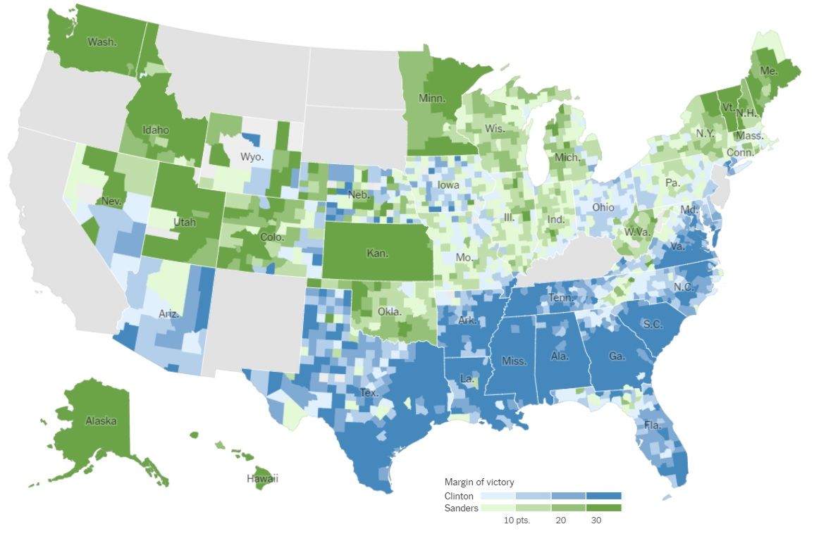 Si se incluye los funcionarios de partido conocidos como superdelegados, los cuales pueden respaldar a cualquier precandidato, Clinton tiene 2.238 delegados, o 94% de los 2.383 necesarios para ganar. Sanders tiene 1.468.