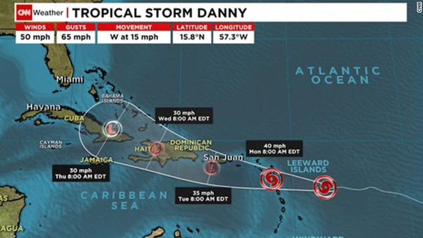 Danny, la cuarta tormenta con nombre de la actual temporada de huracanes en el Océano Atlántico, registraba la tarde de este domingo un movimiento hacia el oeste a 24 kilómetros por hora, con vientos sostenidos de 65 kilómetros por hora.