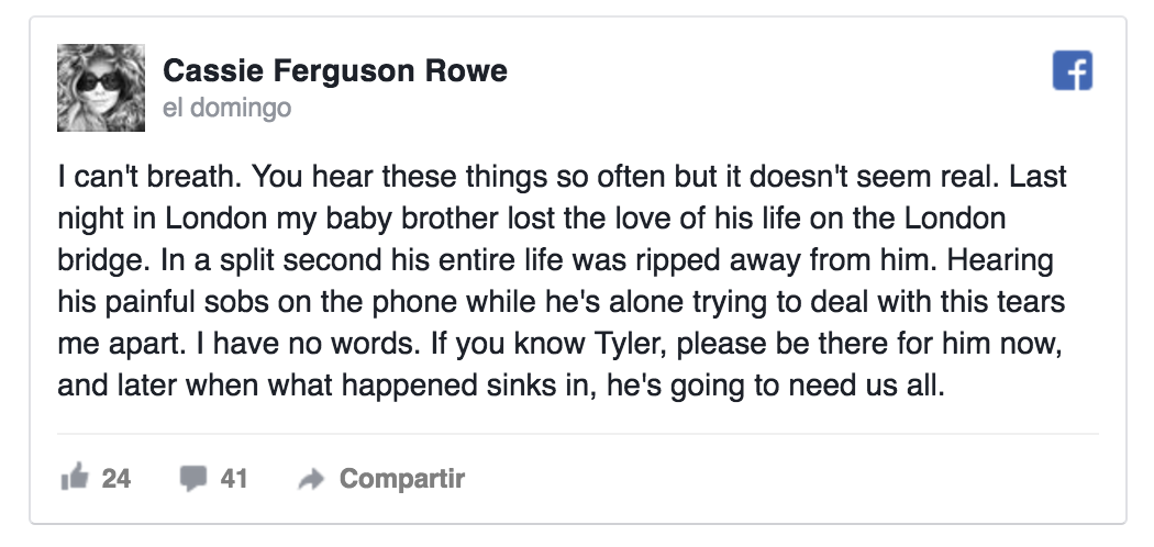 “La abrazó y la vio morir en sus brazos”, ha contado también otra hermana, Cassie Ferguson, al mismo medio. “Mi hermano está roto en un millón de partes”, ha añadido. “Ayer por la noche, mi hermano pequeño perdió el amor de su vida en el puente de Londres. En una fracción de segundo su vida entera le fue arrancada”, narra la hermana en su cuenta de Facebook.