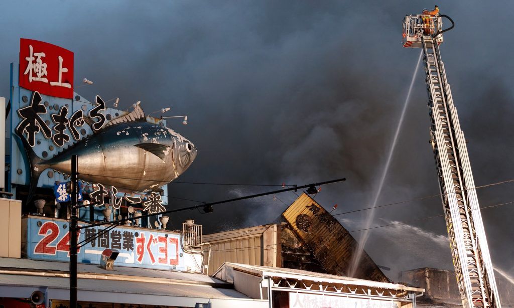 Decenas de bomberos trabajan para apagar un incendio en el famoso mercado de pescado Tsukiji de Japón, cual está repleto de vendedores, restaurantes y turistas.
