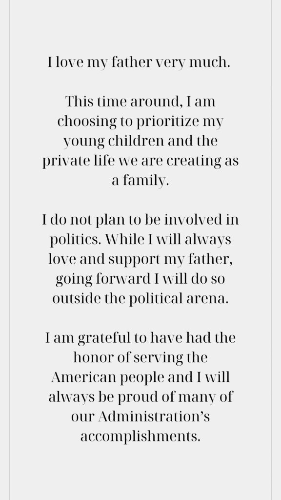 Amo a mi padre. Esta vez he decidido darle prioridad a mis hijos pequeños y la vida privada que estamos creando como una familia. No tengo planeado estar involucrada en política”, dijo Ivanka, de 41 años, en esa declaración emitida después de que su padre anunciara su candidatura el martes por la noche desde Florida.