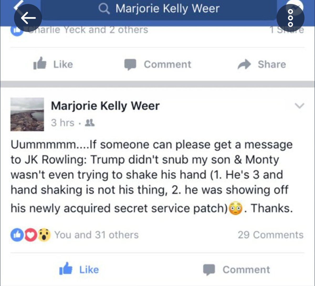 “Si alguien por favor puede darle este mensaje a JK Rowling: Trump no desairó a mi hijo y Monty ni siquiera estaba tratando de darle la mano (1. Él tiene 3 años y estrechar manos no es lo suyo, 2. Él estaba presumiendo su reciente adquirido parche del servicio secreto). Gracias”, escribió la madre del menor.