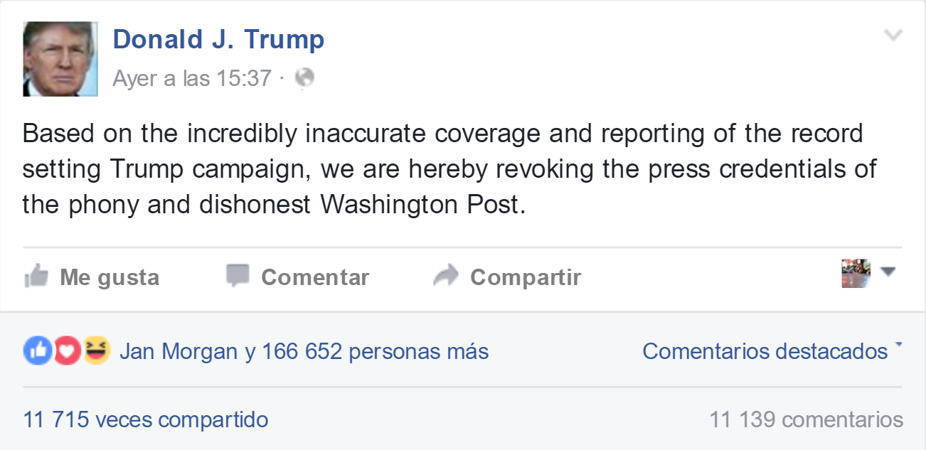 “Basados en la increíblemente imprecisa cobertura sobre la campaña de Trump, revocamos, las credenciales de prensa del falso y deshonesto Washington Post”, señaló Trump.