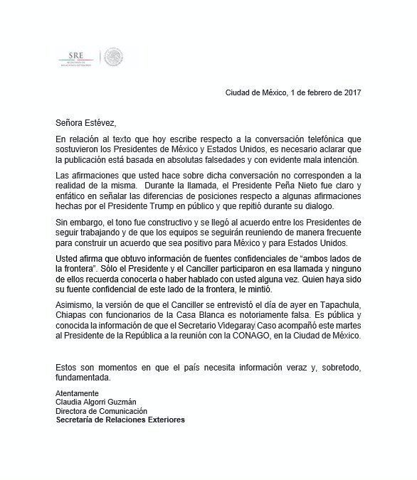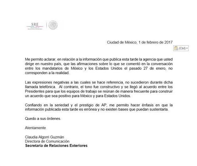 La Secretaría de Relaciones Exteriores emitió un comunicado desmintiendo a la versión de un supuesto maltrato del presidente de Estados Unidos, Donald Trump, al presidente de México, Enrique Peña Nieto, mismo que difundió la agencia The Associated Press, señalando que “está basada en absolutas falsedades y con evidente mala intención” ante una presunta amenaza del republicano con enviar tropas a nuestro país para detener a los “bad hombres”.