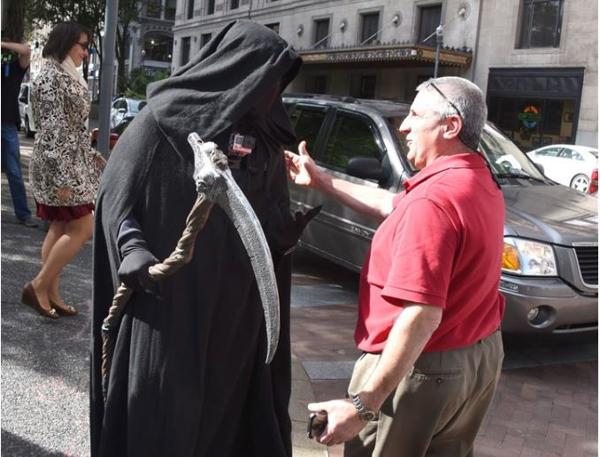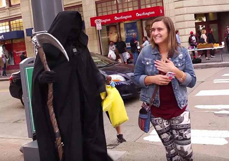 Hombres disfrazados de Parca asustaron a los peatones de Pittsburgh para concientizar sobre el peligro de usar el celular mientras caminan