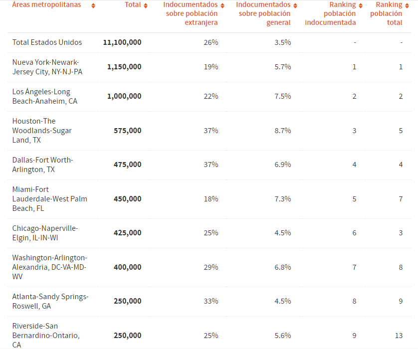 La población con más indocumentados es Nueva York, con 1.2 millones, seguido de Los Ángeles, con un millón. Las restantes ciudades las siguen muy por detrás. Houston ocupa el tercer puesto con 575 mil indocumentados.