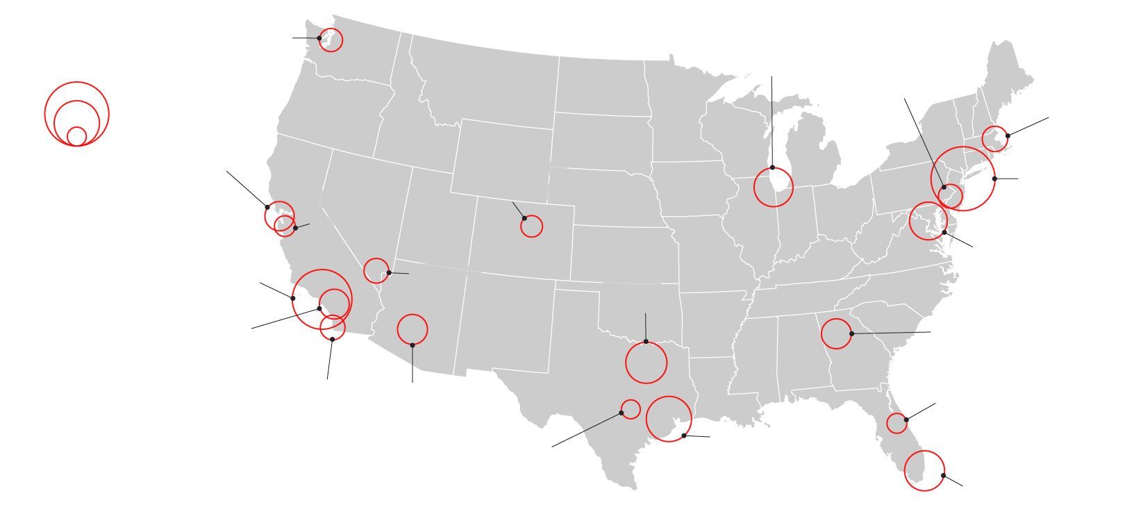 Además, cinco de las 20 áreas metropolitanas se encuentran en California (Los Ángeles, Riverside-San Bernardino, San Francisco, San Diego y San José).
