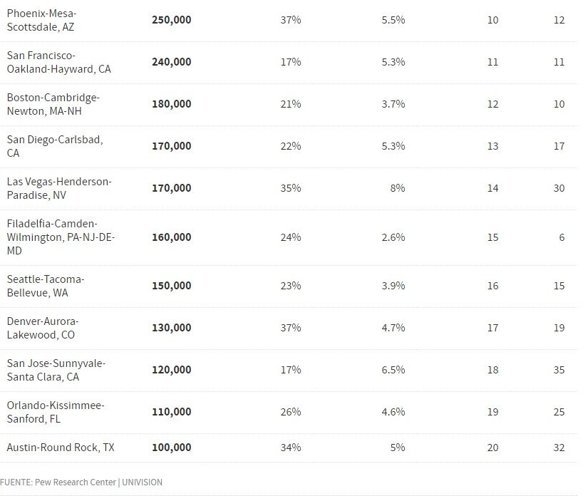 Tal como señala el estudio, del total de los inmigrantes, 6.8 millones (el 61 por ciento), viven en únicamente 20 áreas metropolitanas, a pesar de que estas zonas concentran solo un 36 por ciento de la población total de Estados Unidos.