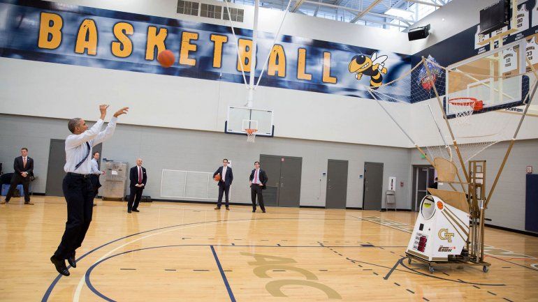 Obama intentando tiros de tres puntos cuando terminaba de dar un discurso en la Universidad de Georgia.