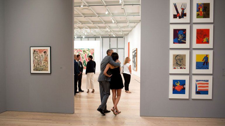 Obama abraza a su hija Malia mientras miraban las obras de arte en el Whitney Museum de Nueva York.