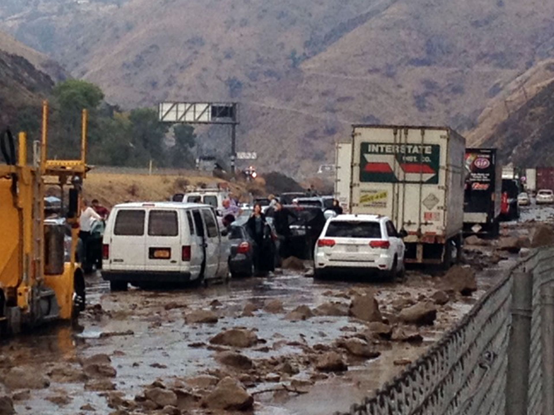 La Interestatal 5 fue cerrada debido a que las lluvias produjeron un alud que dejó ocultos varios automóviles que transitaban por la vialidad.