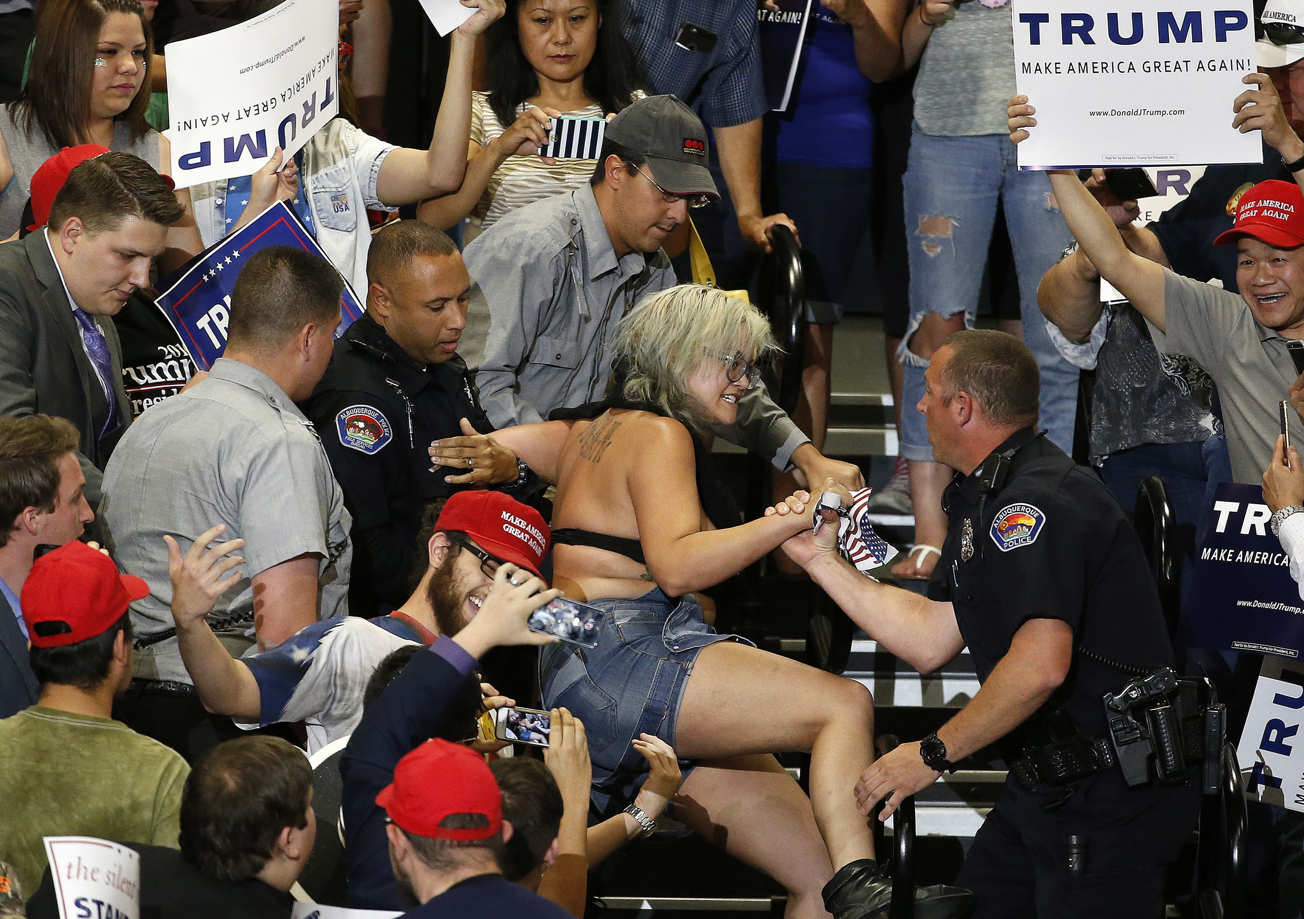 Policías retiran a una manifestante durante un acto de campaña del aspirante a la candidatura presidencial republicana Donald Trump en Albuquerque, New Mexico, el martes 24 de mayo de 2016. Foto de AP.