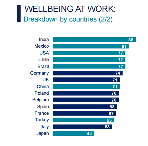 India, México, Brasil y Chile obtuvieron la mayor puntuación de todos los elementos vinculados al bienestar en el trabajo, en concreto en su satisfacción emocional. Los expertos tomaron como variables el disfrute del empleado por ir a trabajar a primera hora, el interés en el trabajo y la confianza en su futuro profesional.