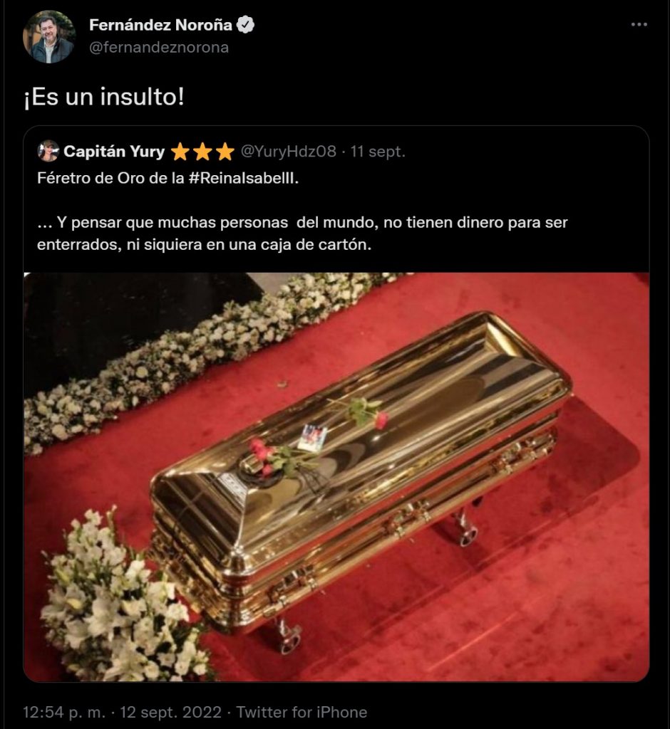 “En lo que quedó convertido el oro venezolano“, dice un internauta en una publicación con una imagen de un féretro dorado colocado sobre una moqueta roja y rodeado de flores. Mientras que otro asegura: “En un féretro de oro descansan los restos de la reina… Se llevó nuestro oro a la tumba”.