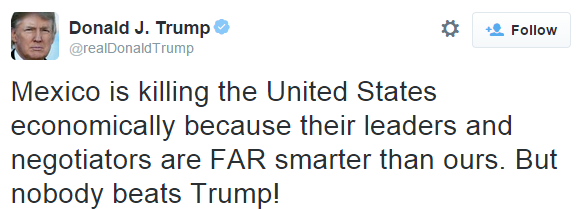 “México está matando a Estados Unidos económicamente porque sus líderes y negociadores son POR MUCHO más inteligentes que los nuestros. ¡Pero nada le gana a Trump!”, publicó el empresario.