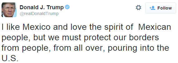 “Me gusta México y amo el espíritu de los mexicanos, pero debemos proteger nuestras fronteras de la gente, de todas partes, que está entrando a los Estados Unidos”, afirmó Trump en su cuenta de Twitter.