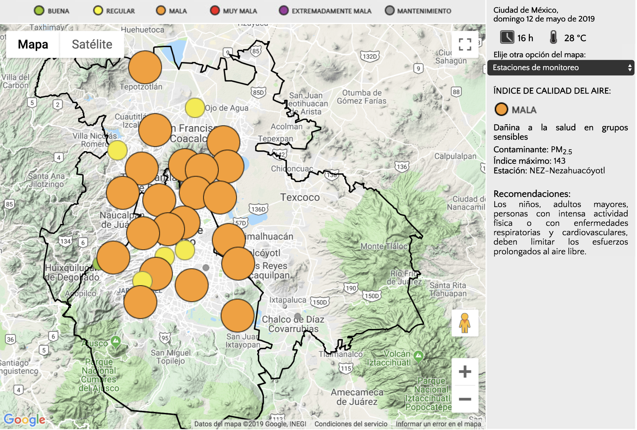 La Dirección de Monitoreo Atmosférico de la Ciudad de México reporta que a las 16:00 h era mala la calidad del aire en gran parte del Valle de México, principalmente en la Estación Nezahualcóyotl, al oriente de la ciudad.