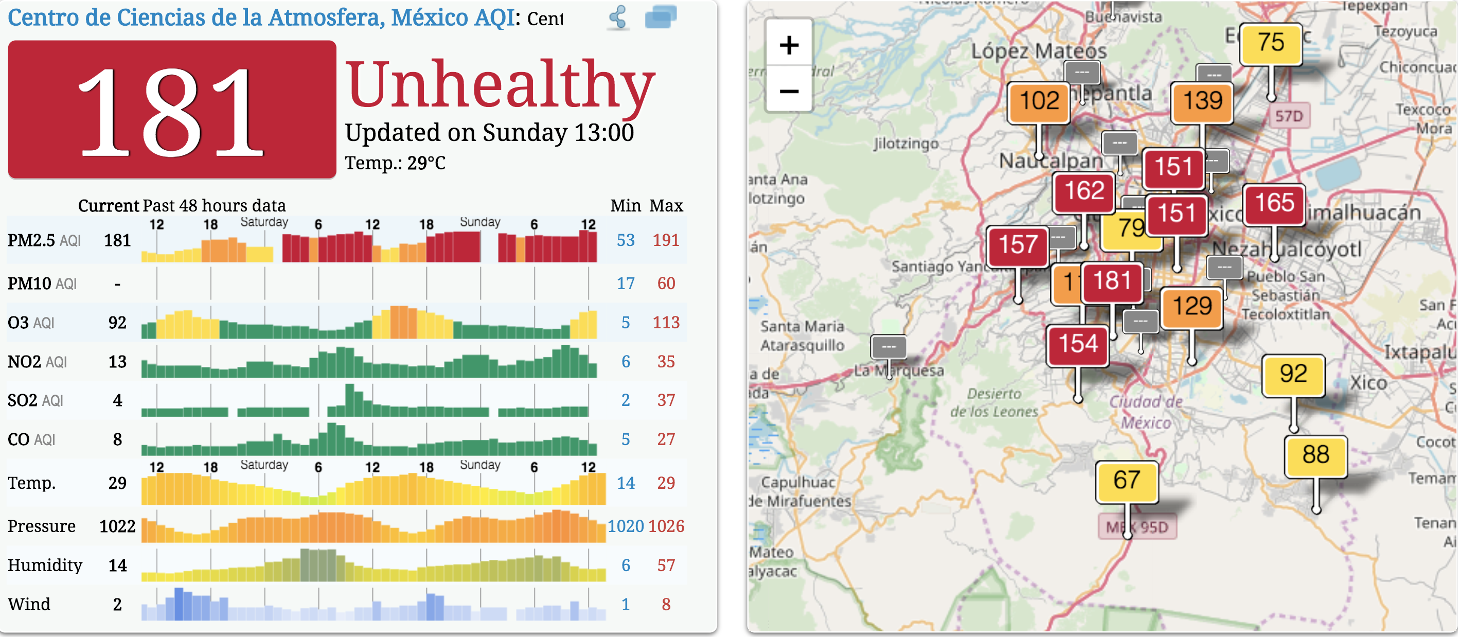 De acuerdo con el reporte del Centro de Ciencias de la Atmósfera en la Ciudad de México, gran parte del Valle de México presenta muy mala calidad del aire, indicando que se respira aire “insalubre” en algunas alcaldías y municipios del Valle de México, como lo son Nezahualcóyotl, Azcapotzalco, Miguel Hidalgo, Tlalpan, Cuauhtémoc y Benito Juárez.