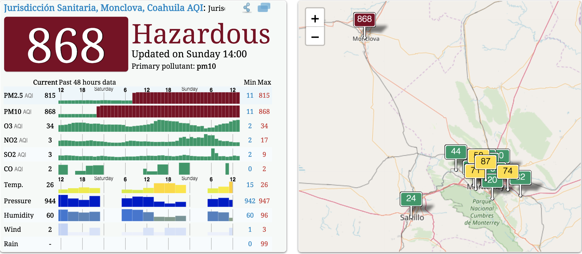 En tercer lugar se ubica Monclova, Coahuila, con 868 puntos en el índice. También el aire que se respira en la localidad se considera “peligroso”.