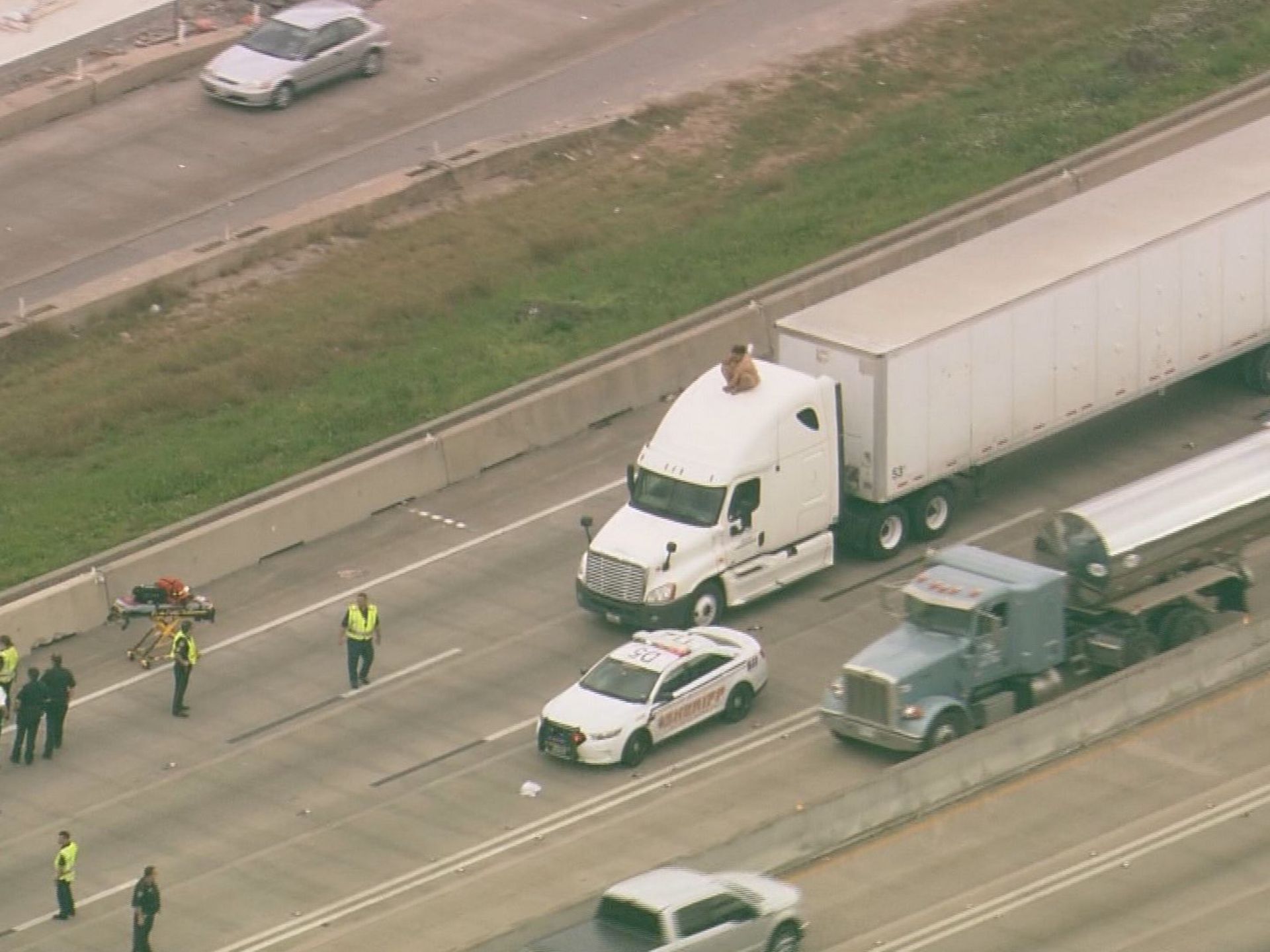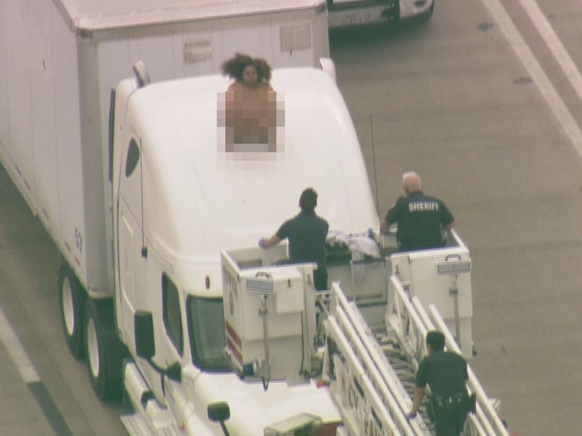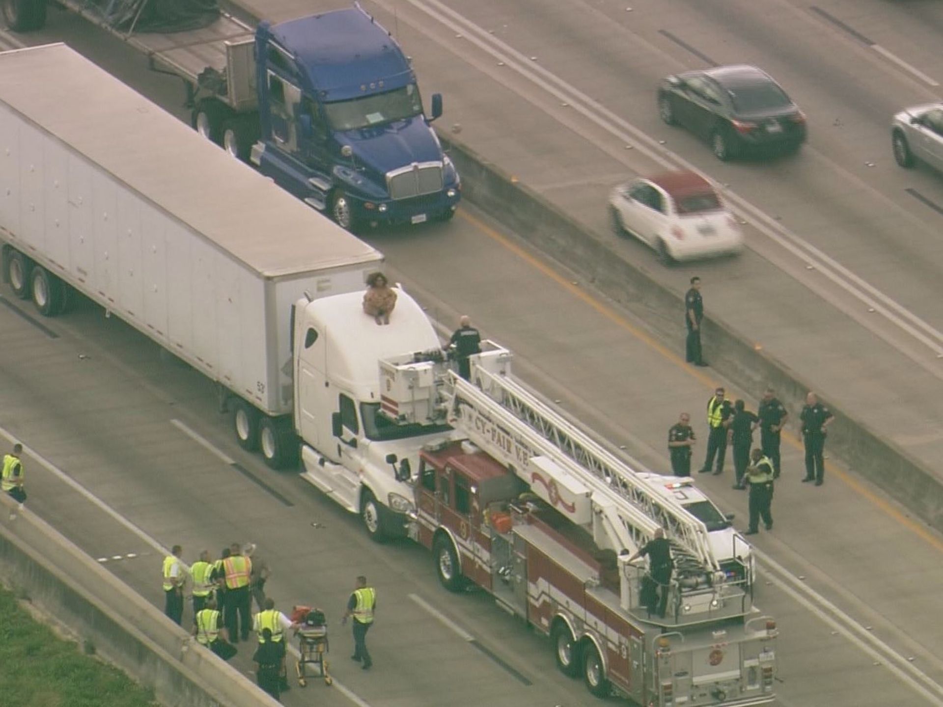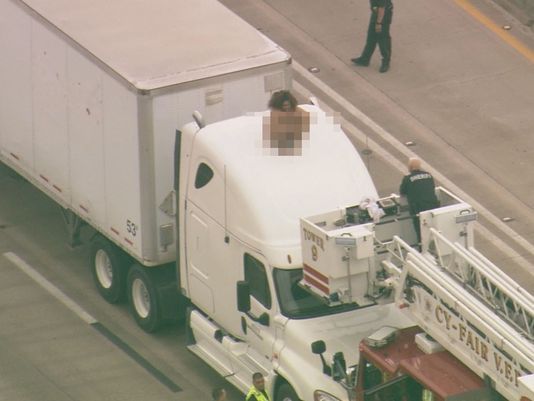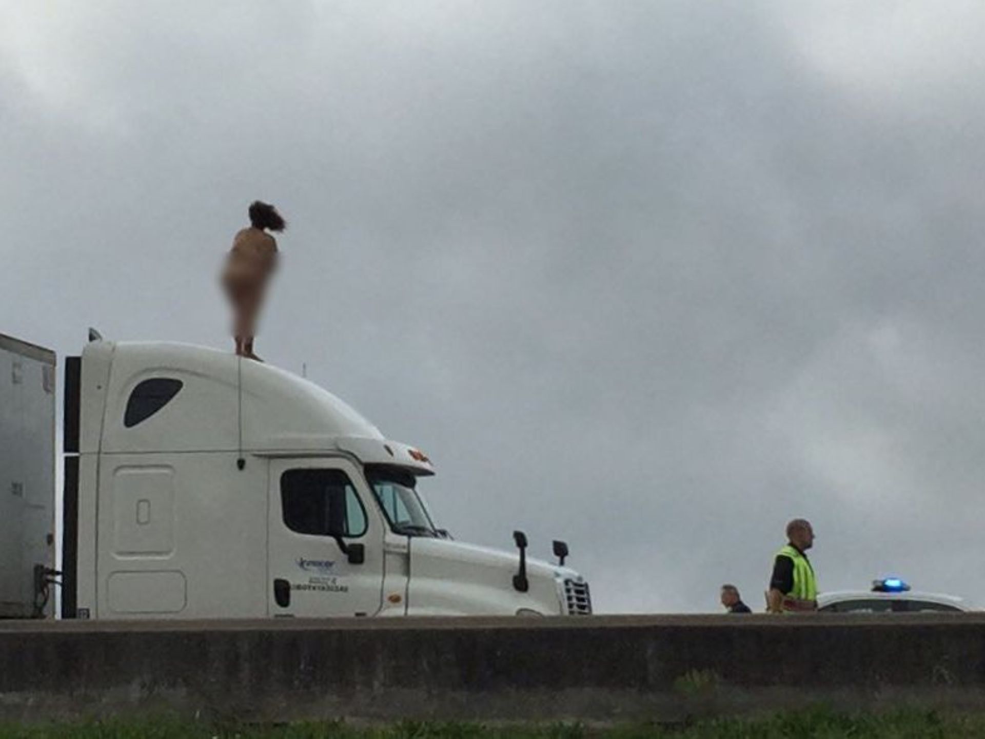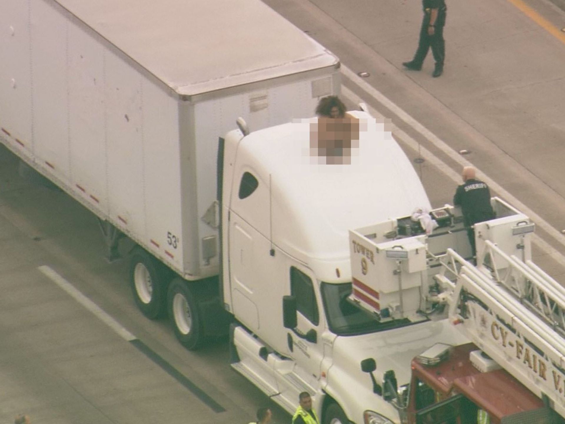 Una mujer trepó al techo de la cabina de un tráiler, bailó desnuda, insultó a la policía y provocó colapso vial al noroeste de Houston