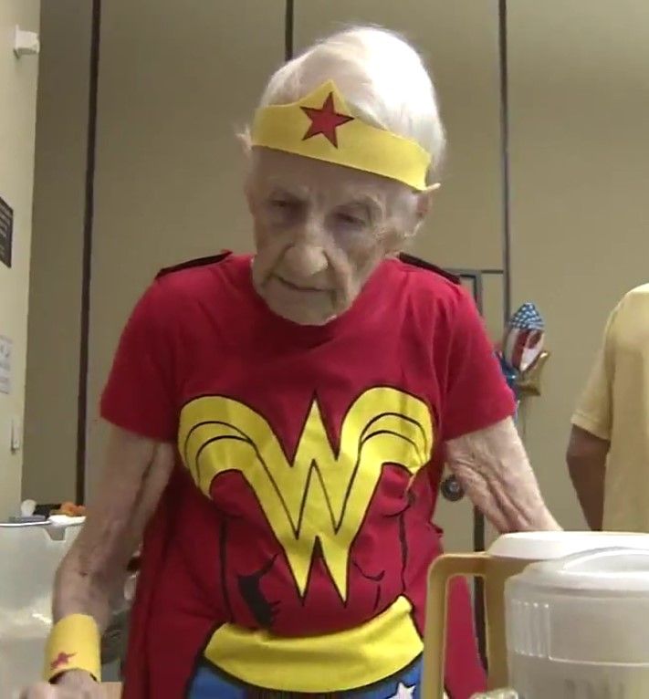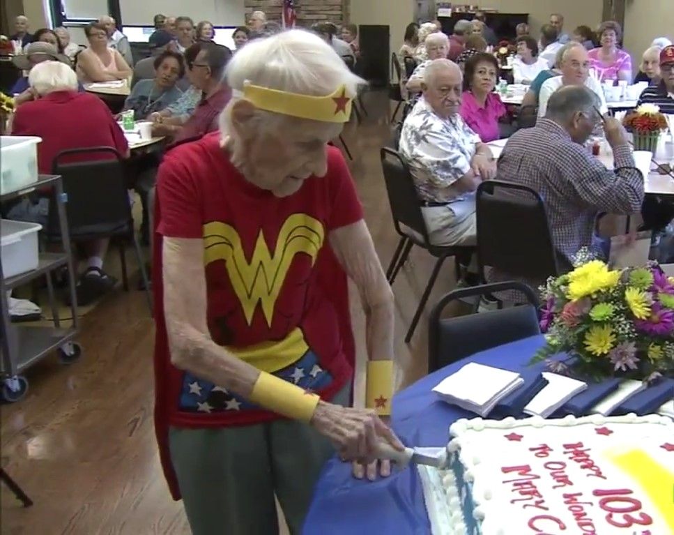 Mary Cotter celebró sus 103 años vestida como la heroína rodeada de su familia y del asilo donde ella ha servido como voluntaria 25 años