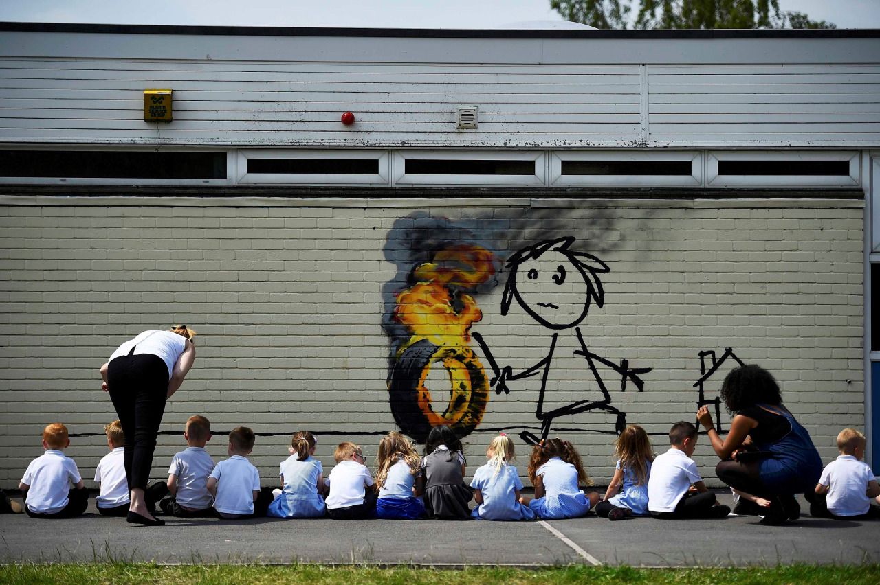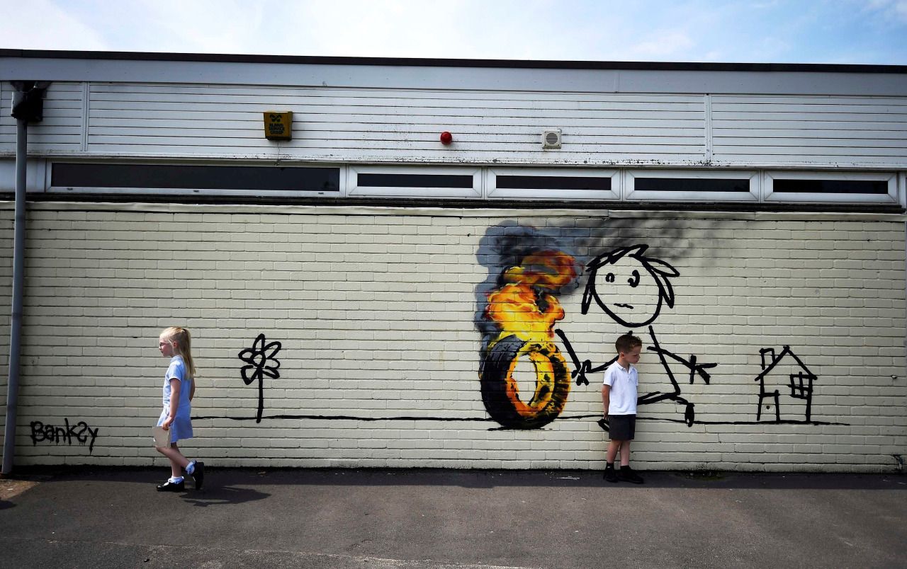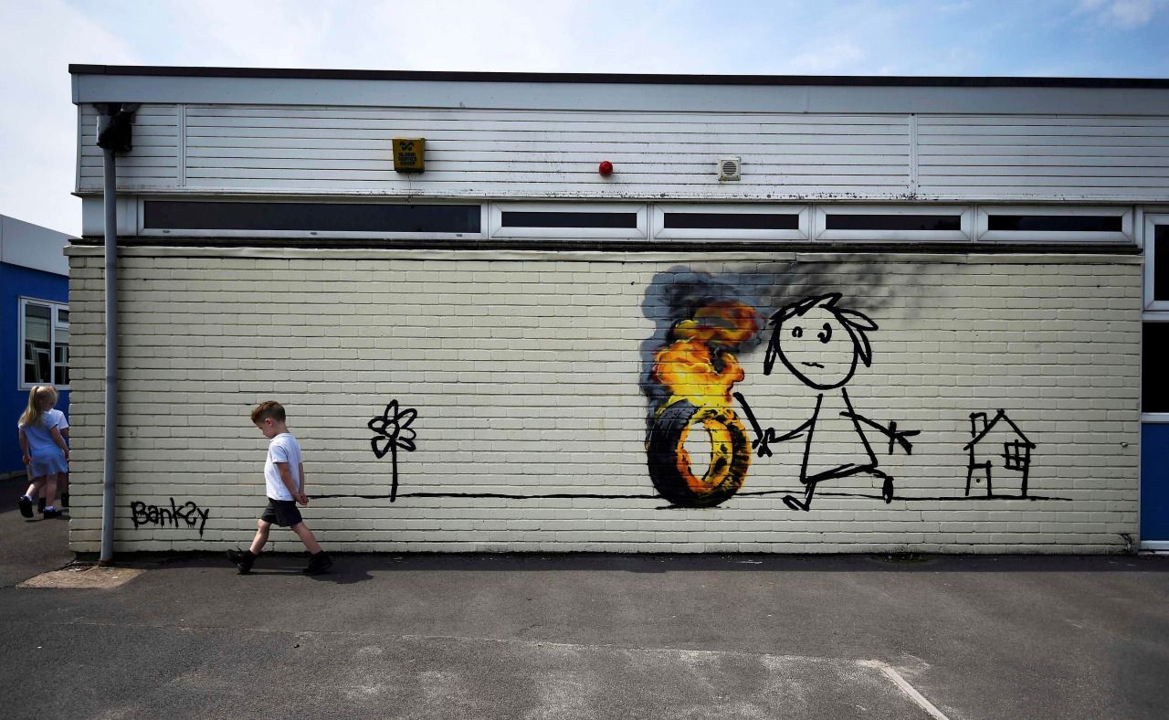 El misterioso artista británico Banksy, cuya verdadera identidad aún se desconoce, sorprendió a los pequeños alumnos de la escuela elemental Bridge Valley School, de su Bristol natal, al sureste de Inglaterra, con una obra de arte en la que se observa a un niño conduciendo con un palo un neumático en llamas, acompañado de un mensaje en el que saluda y agradece a los alumnos de esa institución.