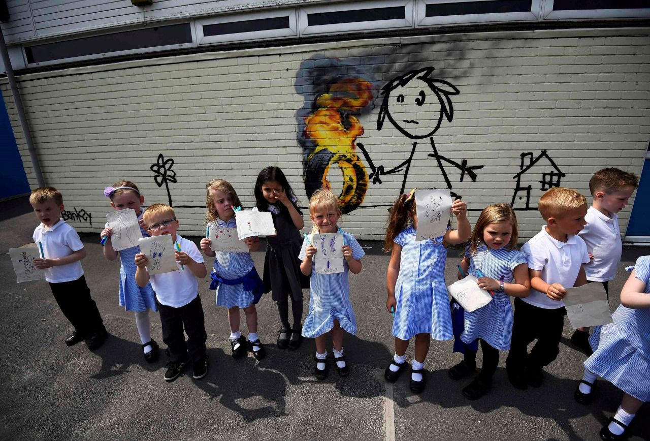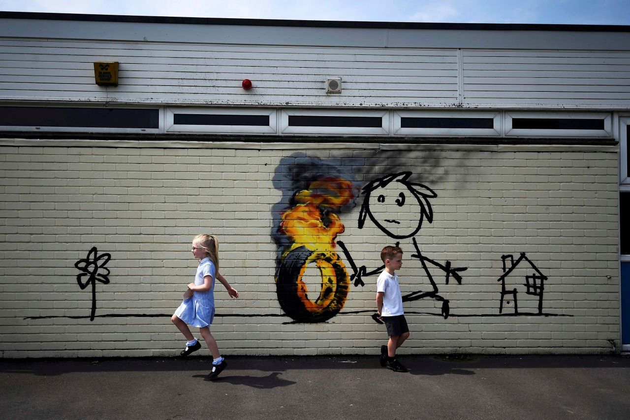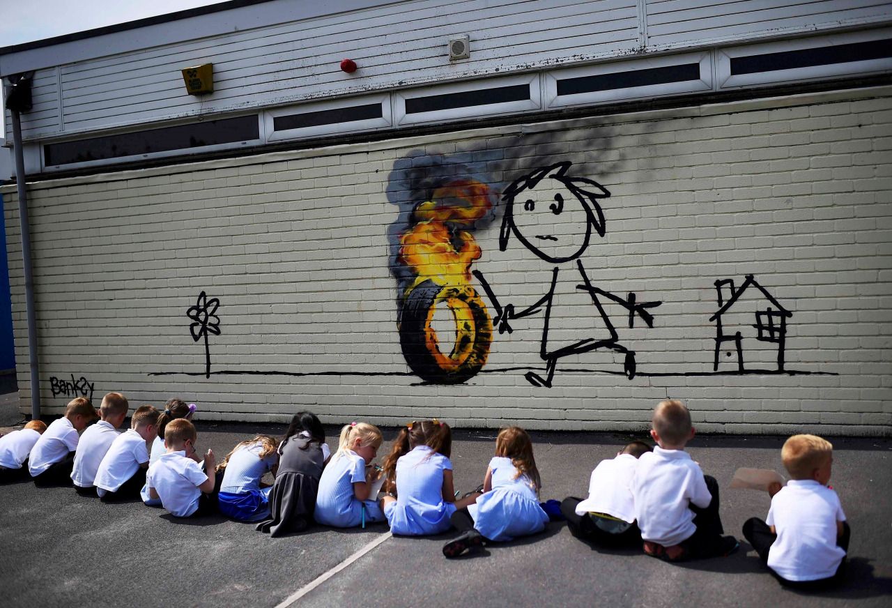 El misterioso artista británico Banksy, cuya verdadera identidad aún se desconoce, sorprendió a los pequeños alumnos de la escuela elemental Bridge Valley School, de su Bristol natal, al sureste de Inglaterra, con una obra de arte en la que se observa a un niño conduciendo con un palo un neumático en llamas, acompañado de un mensaje en el que saluda y agradece a los alumnos de esa institución.