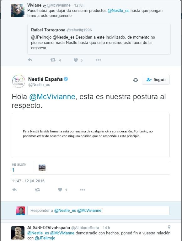 Sin embargo, la respuesta no sirvió. Profesionales y aficionados propusieron en las redes no consumir ningún producto Nestlé. Ante la cantidad de mensajes que recibió la cuenta oficial de Twitter de la multinacional suiza en España, este día la marca anunció en su cuenta que “Nestlé ha decidido que JPelirrojo deje de ser imagen de la campaña Maxibon por manifestar su alegría por la muerte de un ser humano”.
