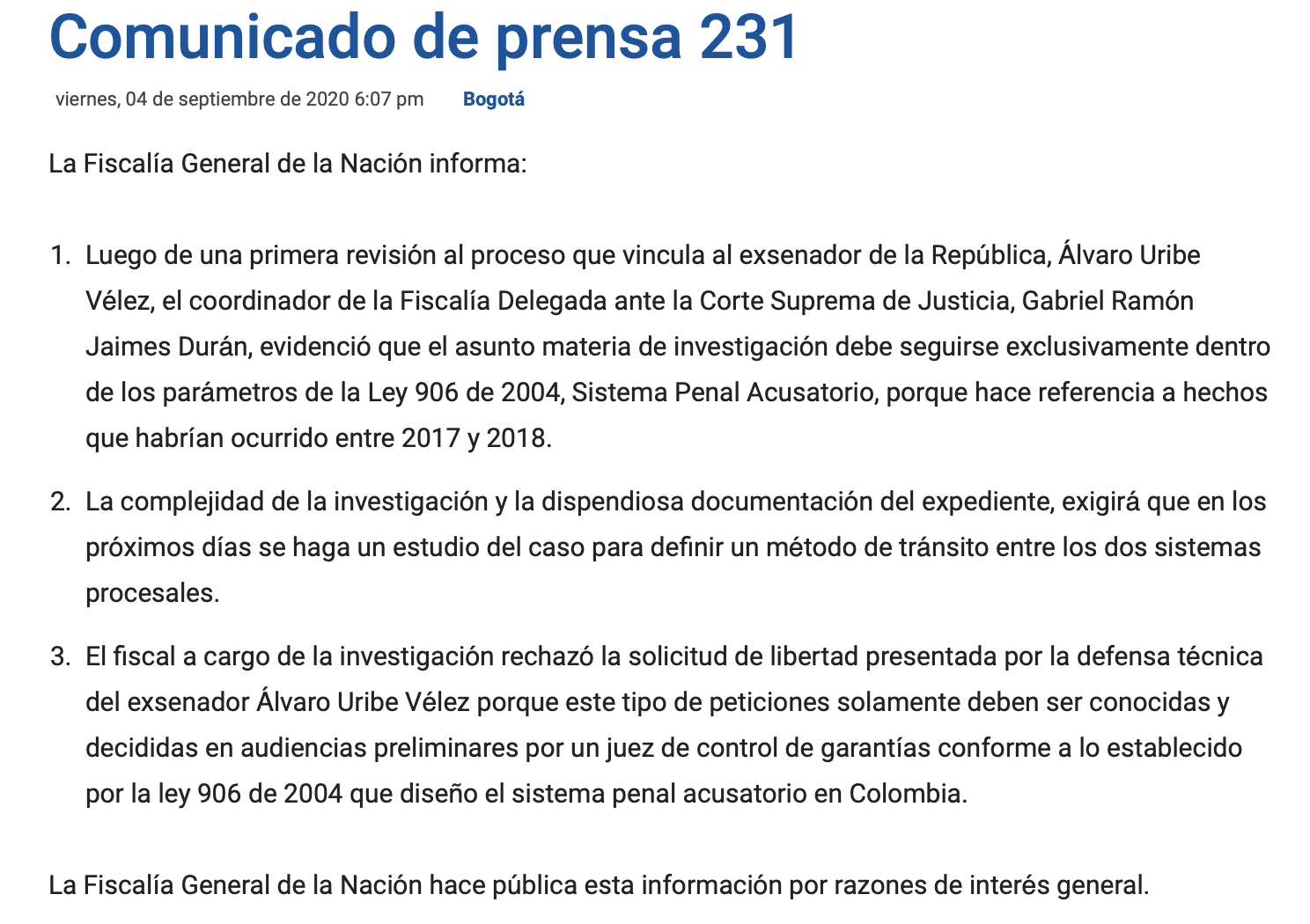 “El fiscal a cargo de la investigación rechazó la solicitud de libertad presentada por la defensa técnica del exsenador Álvaro Uribe Vélez porque este tipo de peticiones solamente deben ser conocidas y decididas en audiencias preliminares por un juez de control de garantías”, señaló la Fiscalía en un comunicado.