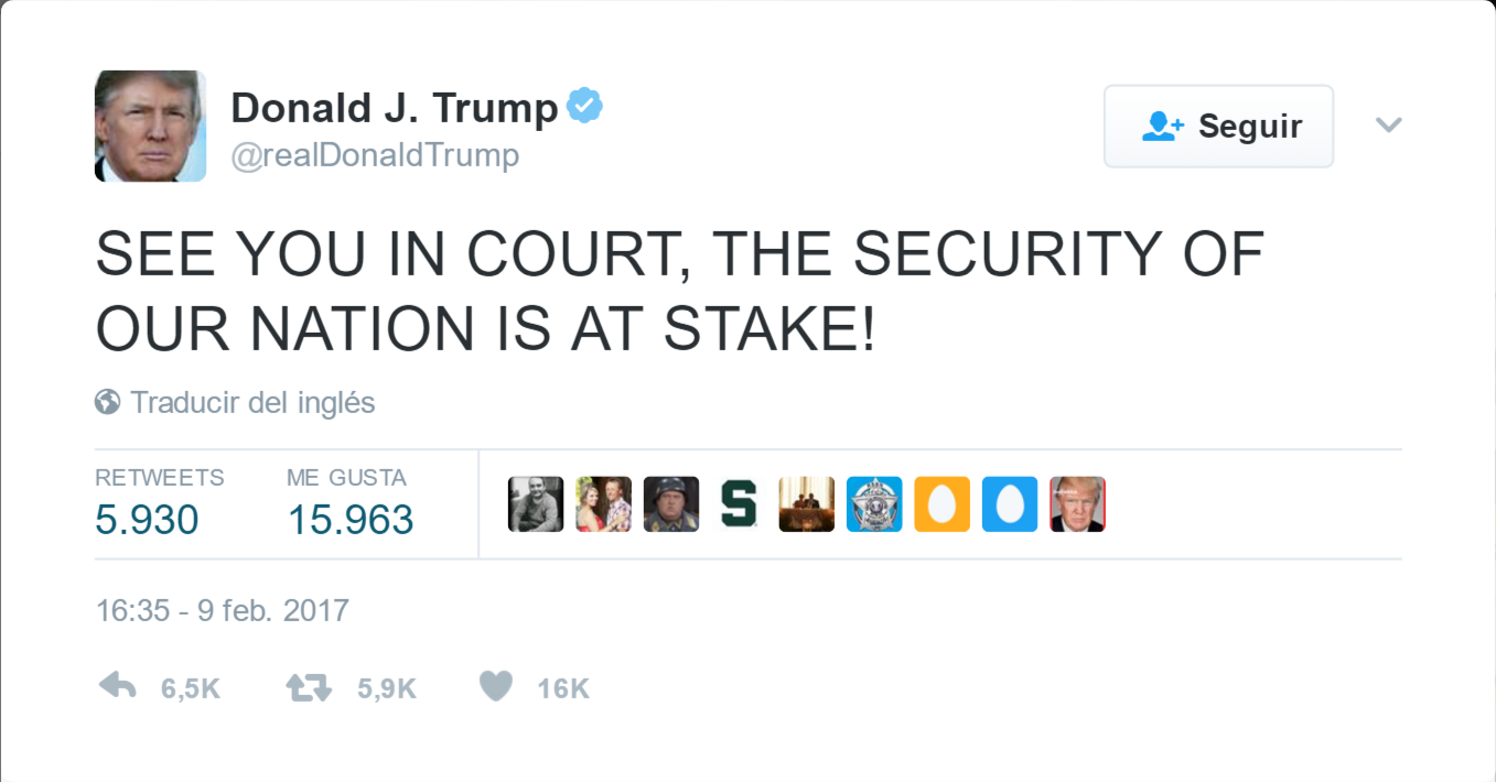 Fiel a su estilo, en su cuenta de la referida red social publicó el siguiente mensaje: “Los veo en la Corte. ¡La seguridad de nuestra nación está en juego!
