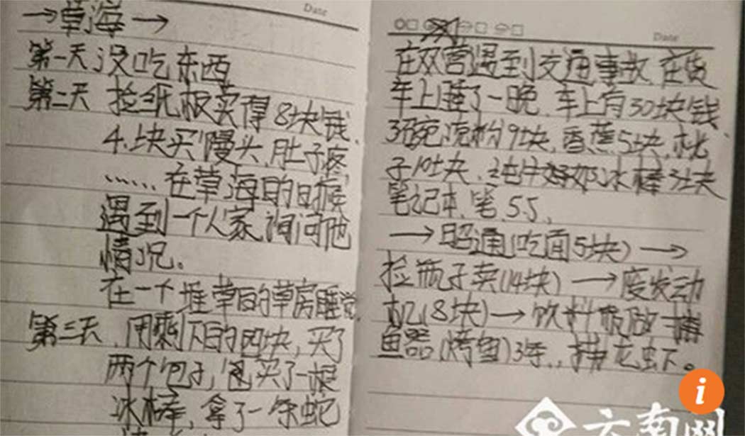Un día encontró un celular que vendió por 30 yuanes, aproximadamente 65 pesos. Con ese dinero compró una pluma y un cuaderno donde escribió sus aventuras. El niño reveló que, aunque le ofrecieron comida y alojamiento, no aceptó ayuda de nadie.